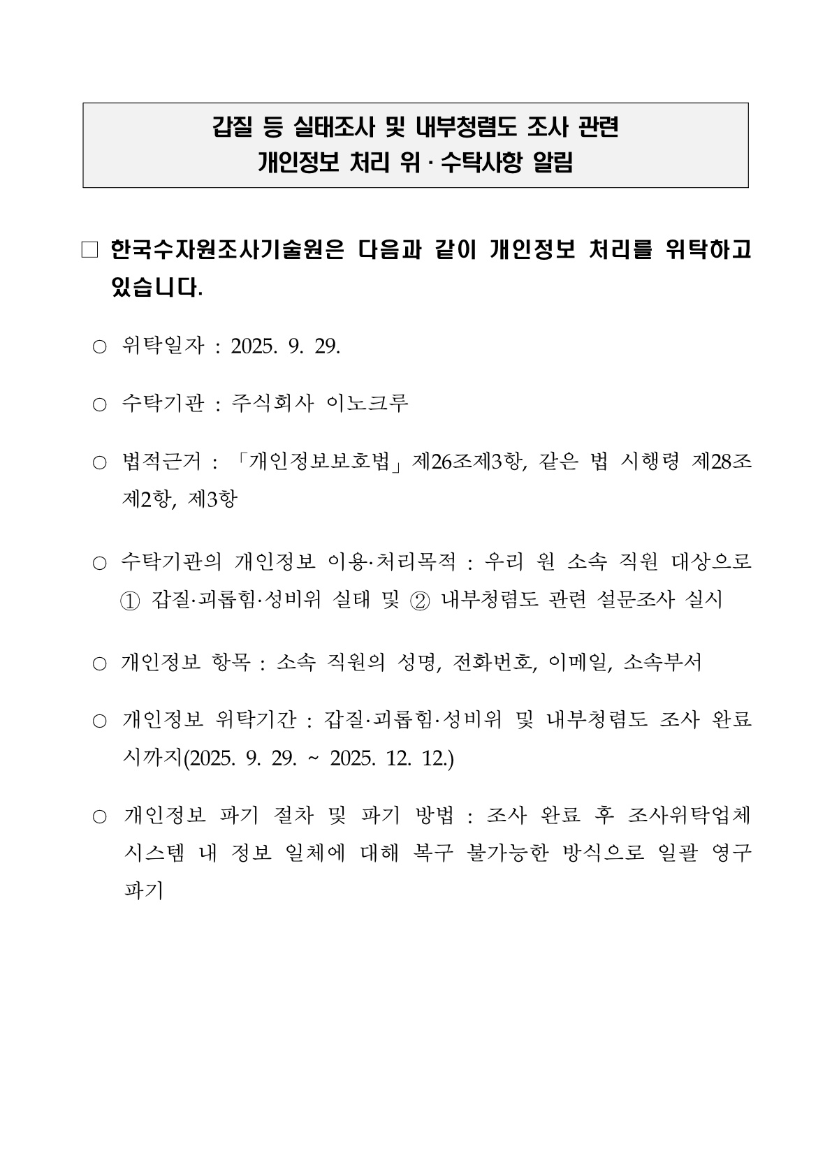 갑질 등 실태조사 및 내부청렴도 조사 관련 개인정보 처리 위·수탁사항 알림